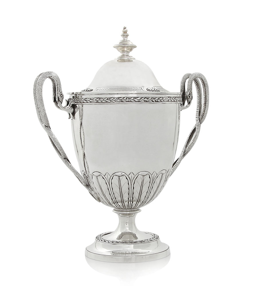 COPPA CON COPERCHIO GIORGIO III IN ARGENTO, LONDRA, 1803, ARGENTIERE W.HALL, biansata con manici a serpi, coperchio con cimatura a trottola e riserve incise a squame, base circolare, profili a foglie lanceolate.