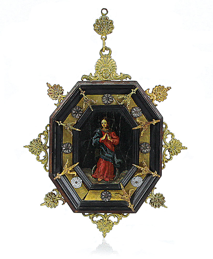 Olio su ardesia ottagonale, cm 10,3x7,8; restauri; cornice ottagonale in legno ebanizzato con applicazioni.