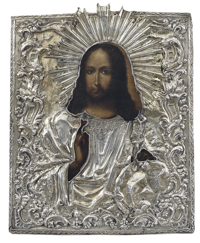 Tempera all'uovo su tavola con riza in argento sbalzato, San Pietroburgo, 1861, cm 28,5x22.