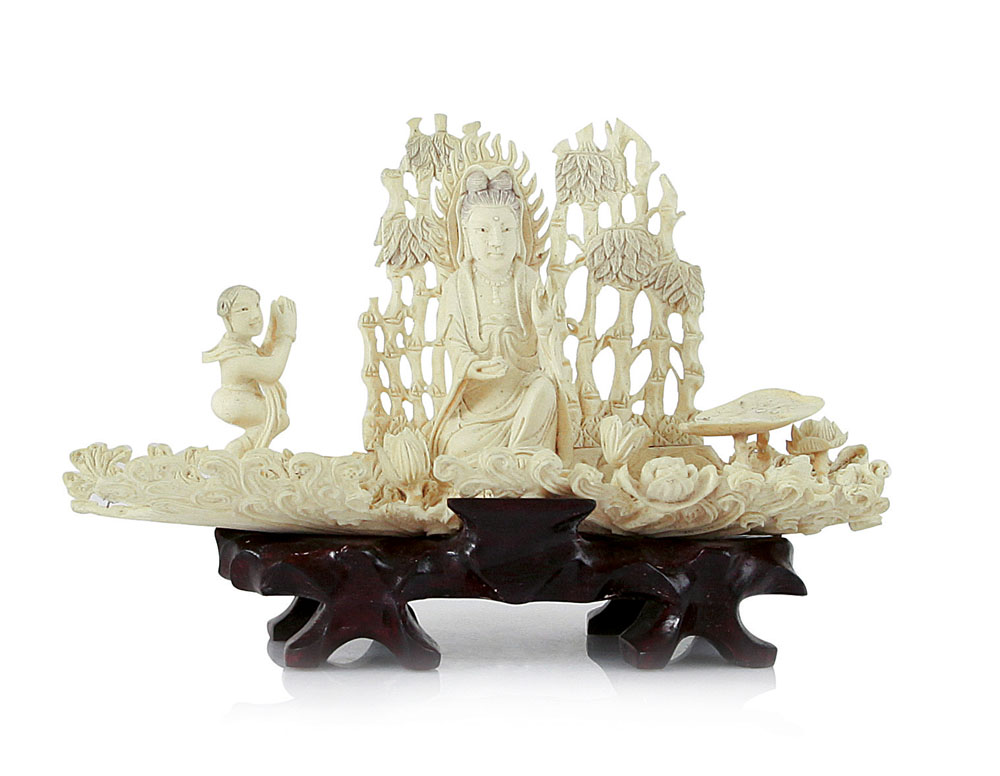 GRUPPO IN AVORIO SCOLPITO, CINA, INIZIO XX SECOLO, raffigurante divinità su fiore di loto con servitore e rami fioriti, base in legno; qualche sbeccatura.