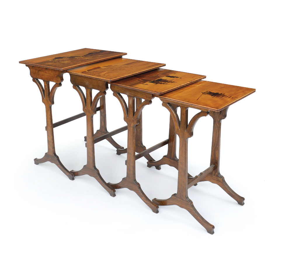 TAVOLINO A CICOGNA INTARSIATO IN LEGNI DI VARIA ESSENZA, GALLE', 1890 CA., composto da quattro elementi a scalare, decoro con paesaggi bretoni; firma ad intarsio "Gallé".
