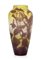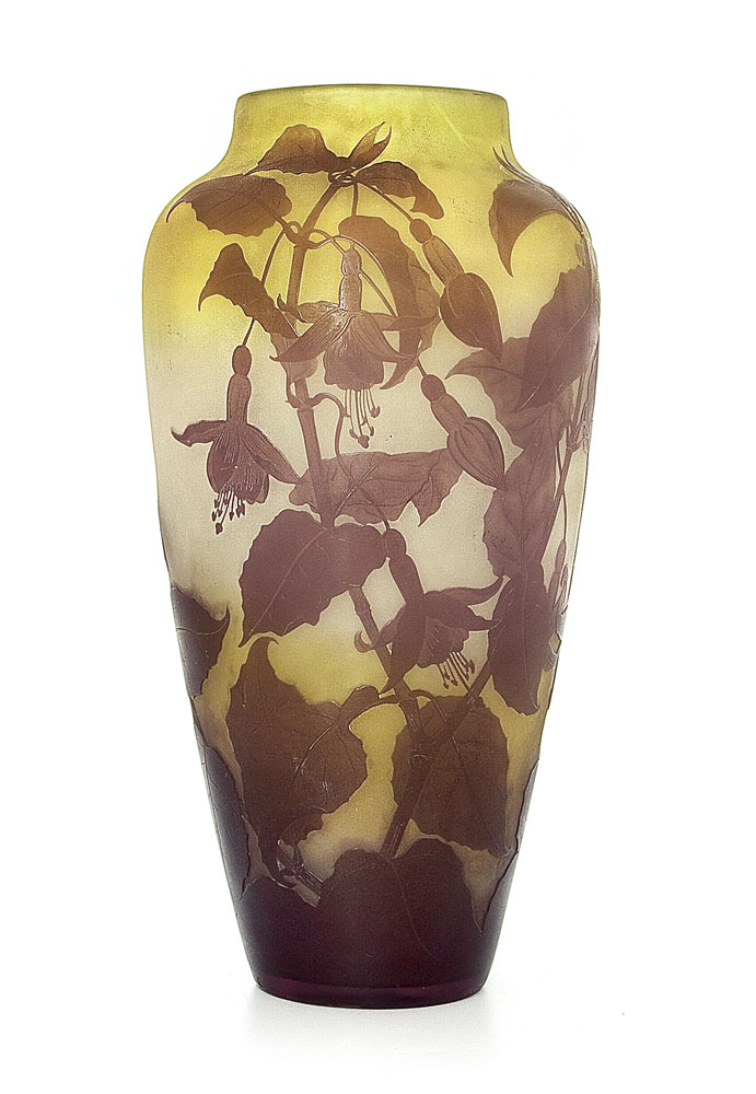 VASO IN VETRO DOPPIO, GALLE', 1900 CA., ovoidale, decoro a campanule e foglie nei toni del viola inciso ad acido su fondo giallo sfumato, firma in rilievo a cammeo "Gallé".