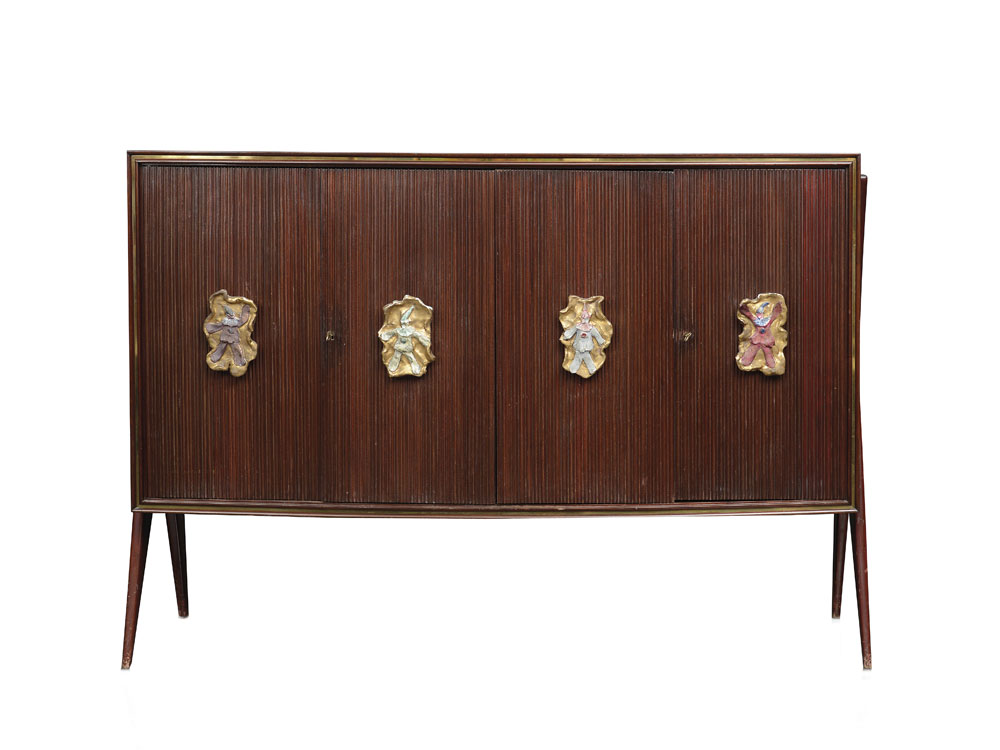 CREDENZA IN LEGNO CON MANIGLIE IN CERAMICA, ANNI '50, PROBABILMENTE BORSANI a quattro ante grissinate; restauri e sbeccature.