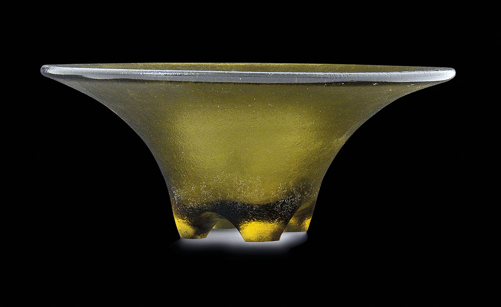 COPPA IN VETRO CORROSO E IRIDATO, VENINI, C.SCARPA, 1930 CA., circolare color ambra, firma ad acido "venini murano".