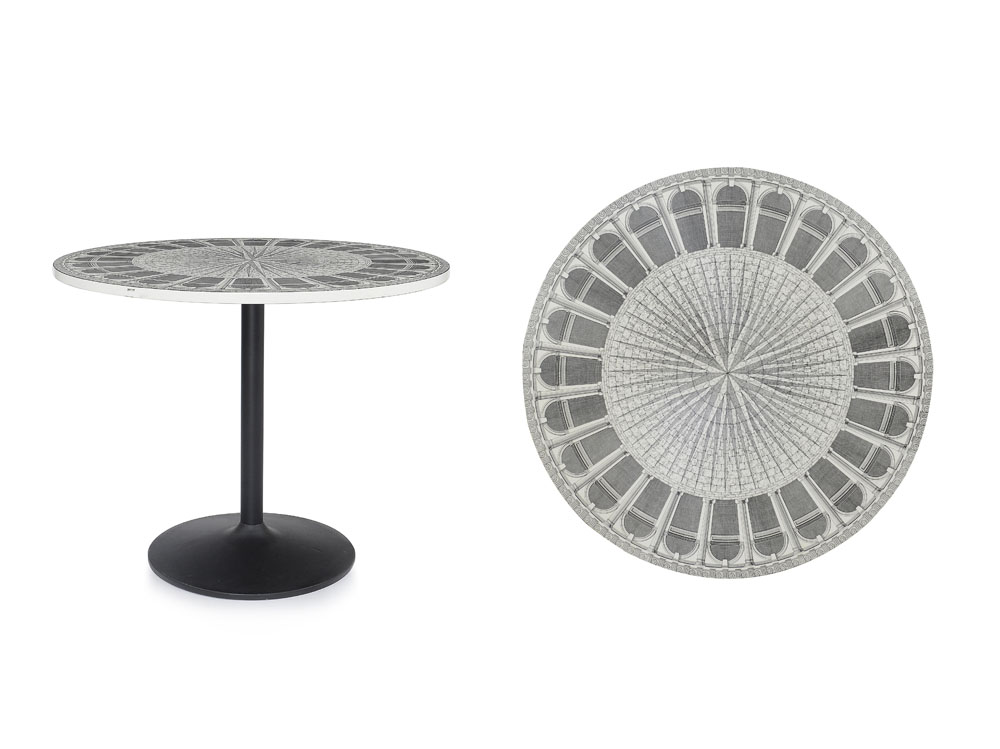 TAVOLO "ARCHITETTURA", FORNASETTI, 1988; piano circolare con decoro monocromo e stelo in ghisa verniciata; marca sul bordo ed interna; lievi usure.