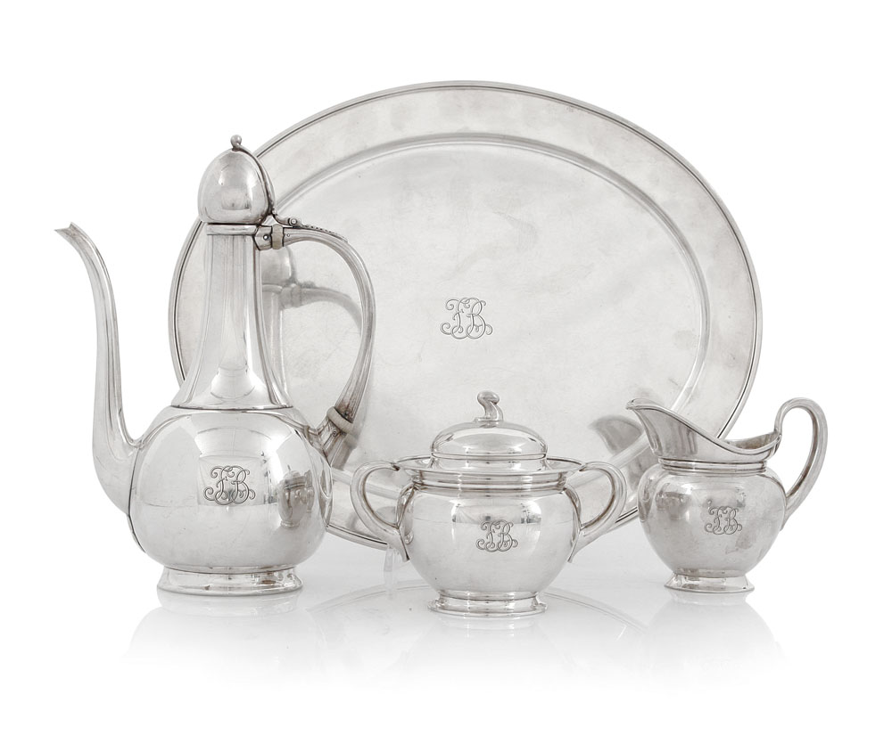 SERVIZIO DA CAFFE' IN ARGENTO, TIFFANY & CO., INIZIO XX SECOLO, composto da caffettiera, zuccheriera con coperchio, lattiera e vassoio ovale, corpi lisci con monogramma inciso.