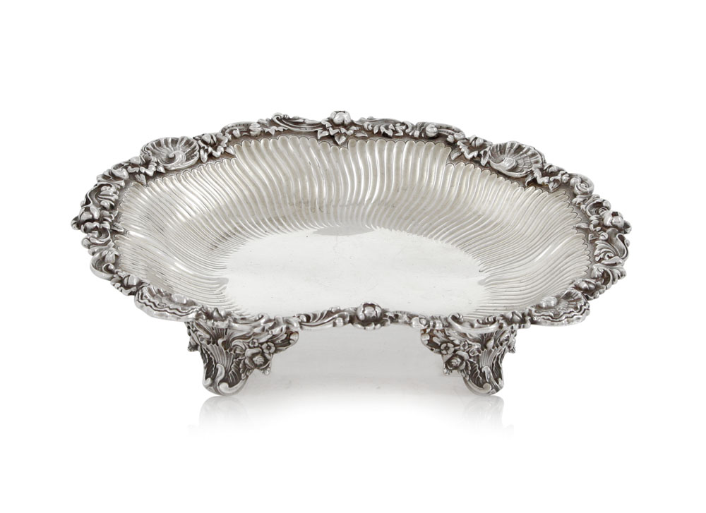 TIFFANY & CO. CENTROTAVOLA IN ARGENTO, TIFFANY & CO., INIZIO XX SECOLO, a profilo sagomato su piedini con bordo a conchiglie e fiori, tesa con scanalature ondulate. Gr. 840, dim. 28,5x23.