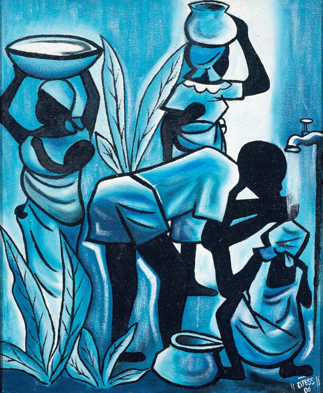 Djess Brazzaville 1970 La fontaine, 2006 Olio su tela, cm. 63,5x52 Firma e data in basso a destra: Djess / 06; al verso sulla tela: Theme: / La Fontaine / 661-39-81. Bibliografia: Marco Parri, Luca Faccenda, Africa Today. The dark side of the art, National Gallery Firenze Editing, Firenze, 2007, p. 211.