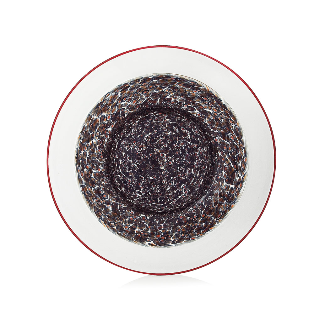 GRANDE PIATTO IN VETRO A MURRINE, VISTOSI, XX SECOLO, bordo ad incalmo e profilo rosso, firma incisa.