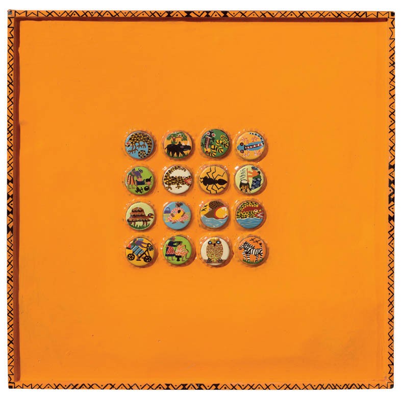 Margaret Majo Murewa 1956 Orange Zebra Tappi di soda e acrilico su tavola, cm. 36x36 Al verso: etichetta National Gallery / Firenze / Margaret Majo / Supercolors Serie / Certificate of Authenticity / *number: 0028*, con data 8-10-08, titolo Orange Zebra e firma autografa dell'artista.