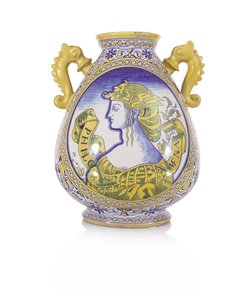 VASO IN CERAMICA, CANTAGALLI, FINE XIX SECOLO, ovoidale con manici a cavalluccio marino, decoro con profilo di "Philomena"; fessura.