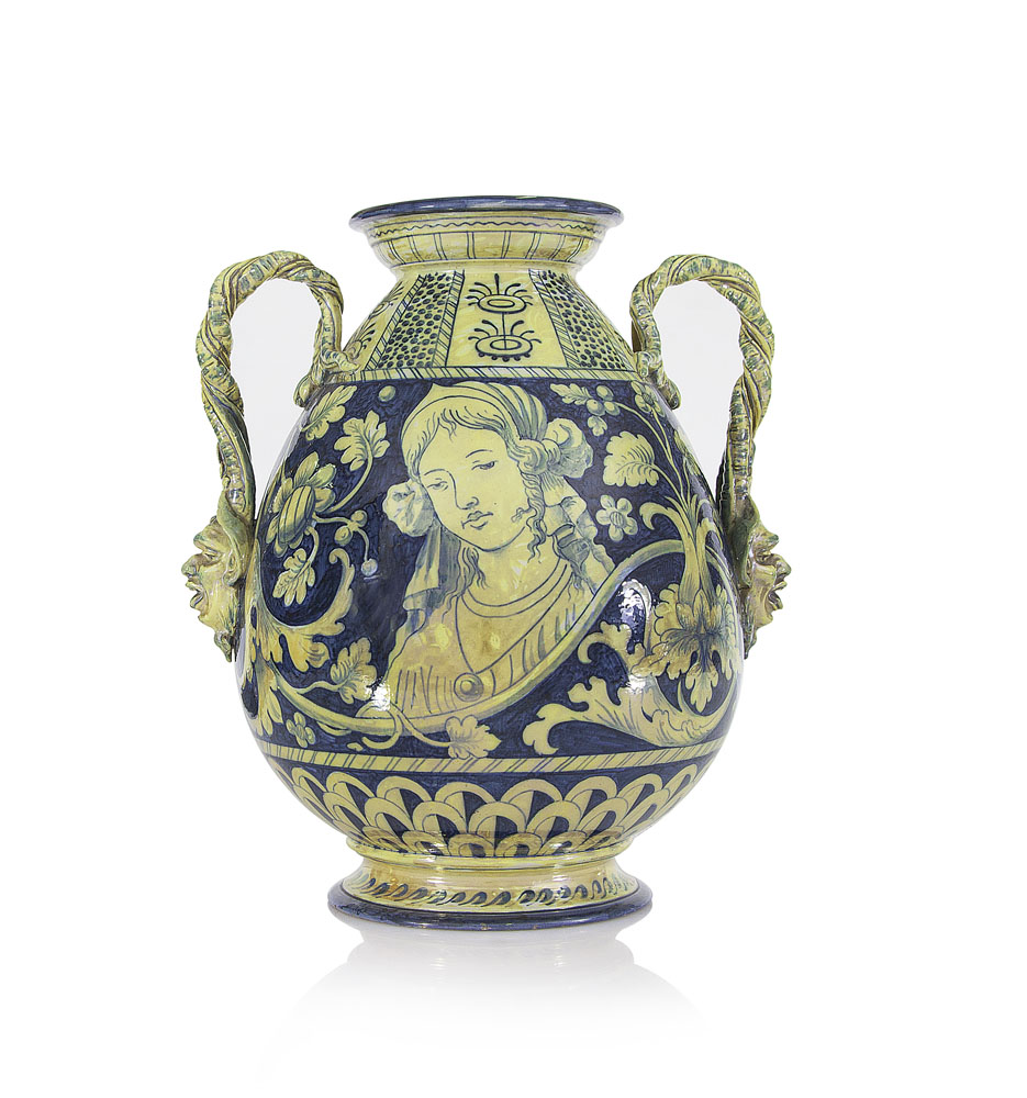 VASO IN CERAMICA, GINORI, XIX SECOLO, ovoidale con manici e mascheroni, decoro con profilo di femminile, marca in blu "Ginori" coronata e numerali; lievi sbeccature.