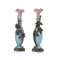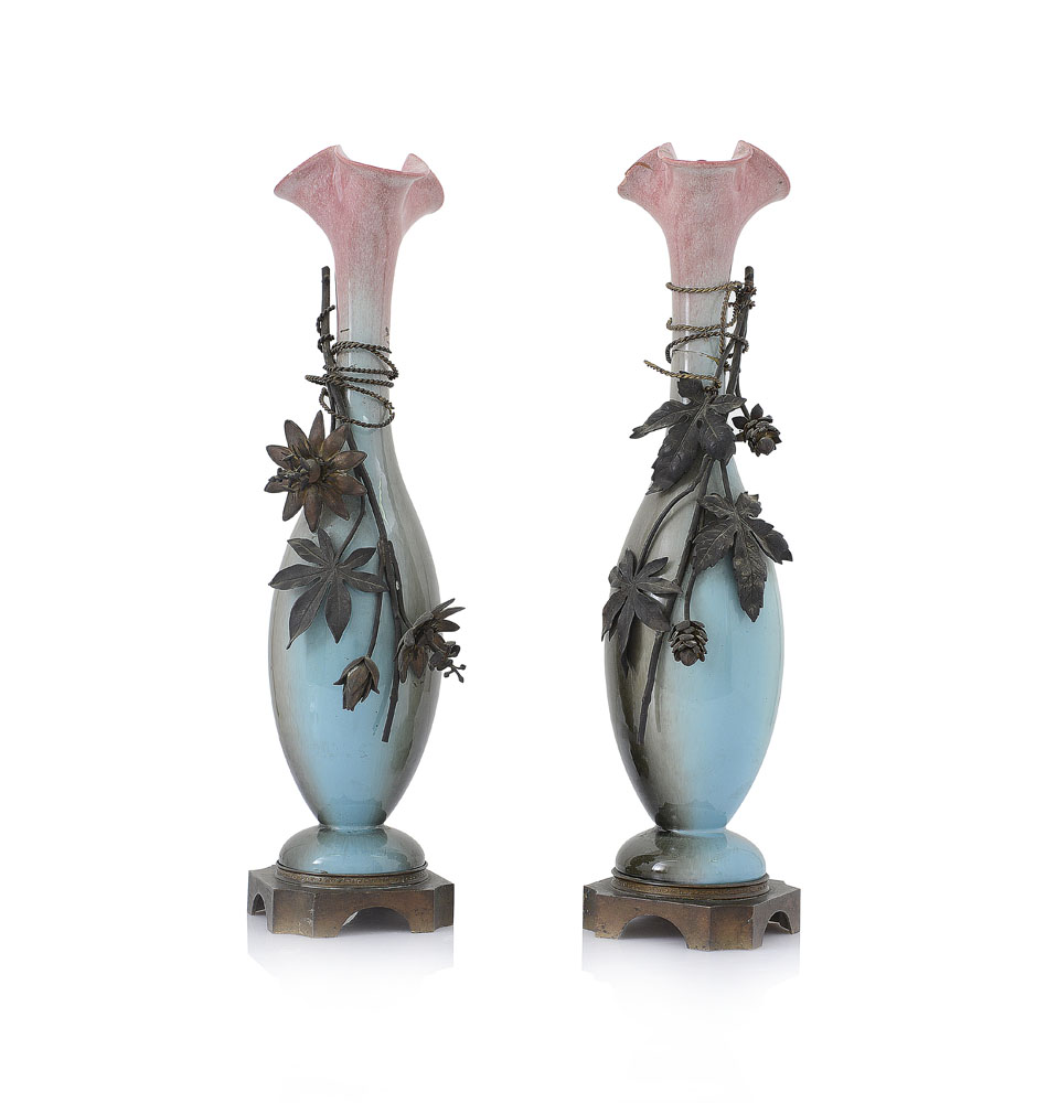 COPPIA DI VASI LIBERTY IN CERAMICA E METALLO, FINE XIX SECOLO, ovoidali su fondo azzurro e rosa striato, decori con cicale e fiori applicati; rincollature e mancanze.