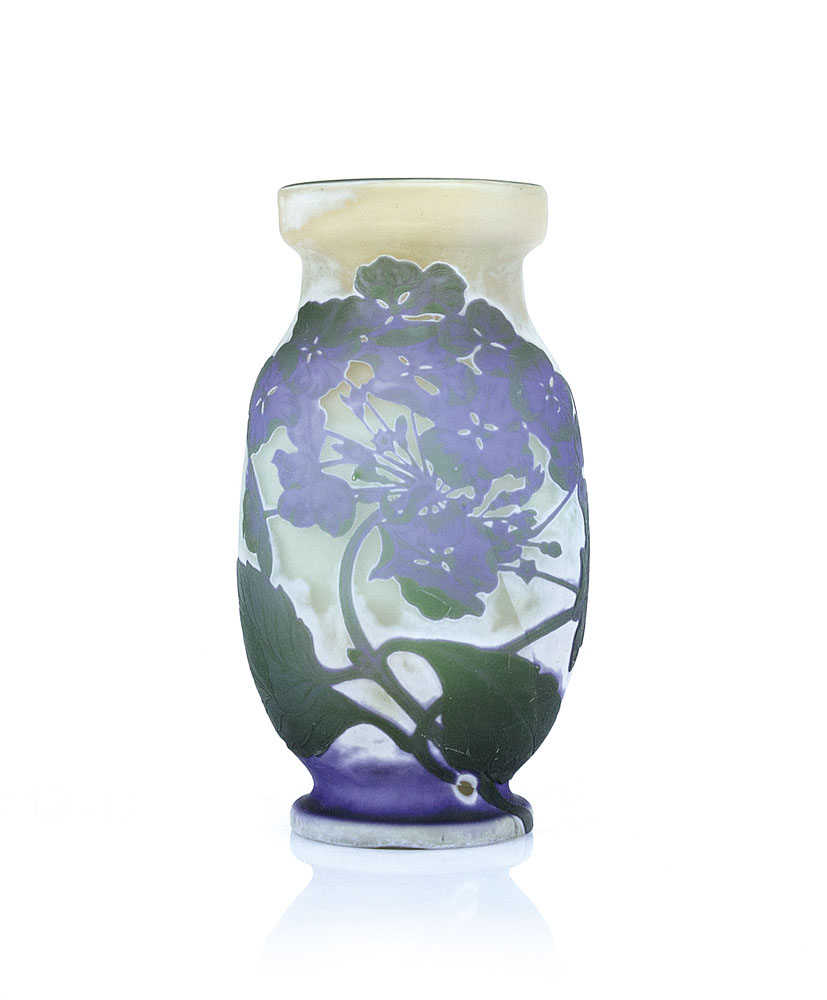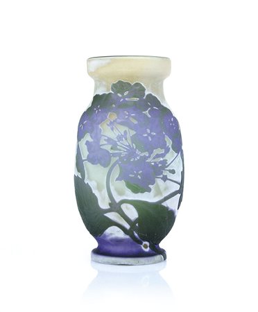 VASO IN VETRO TRIPLO, GALLE', 1910 CA., ovoidale con decoro ad ortensie nei toni del viola e verde inciso ad acido su fondo rosato, firma in rilievo a cammeo "Gallè".
