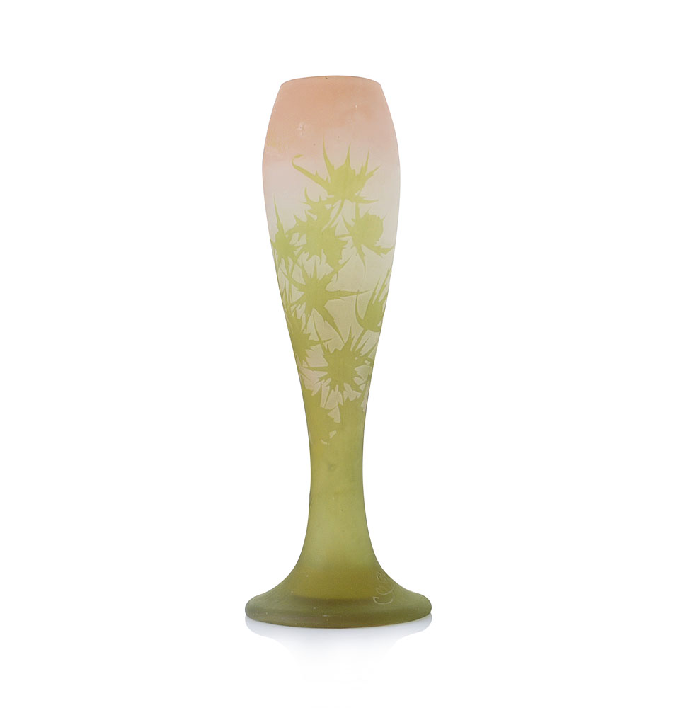 VASO IN VETRO DOPPIO, GALLE', 1905 CA., a balaustro su base circolare, decoro a fiori di cardo nei toni del verde inciso ad acido su fondo rosato, firma incisa "Gallé" con stella ed etichetta originale.