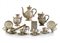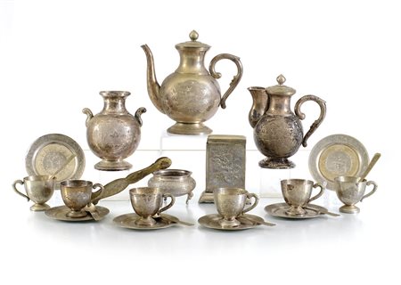 SERVIZIO DA TE' IN METALLO ARGENTATO, CINA, INIZIO XX SECOLO, composto da sei tazze con piatto e cucchiaini, caffettiera, lattiera, zuccheriera con pinza, portatè e ciotola