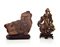 DUE SCULTURE IN PIETRA DURA, CINA, XX SECOLO, di cui una in avventurina con figure su base in legno e una in occhio di tigre con figure su base in legno; la seconda con restauro e mancanza