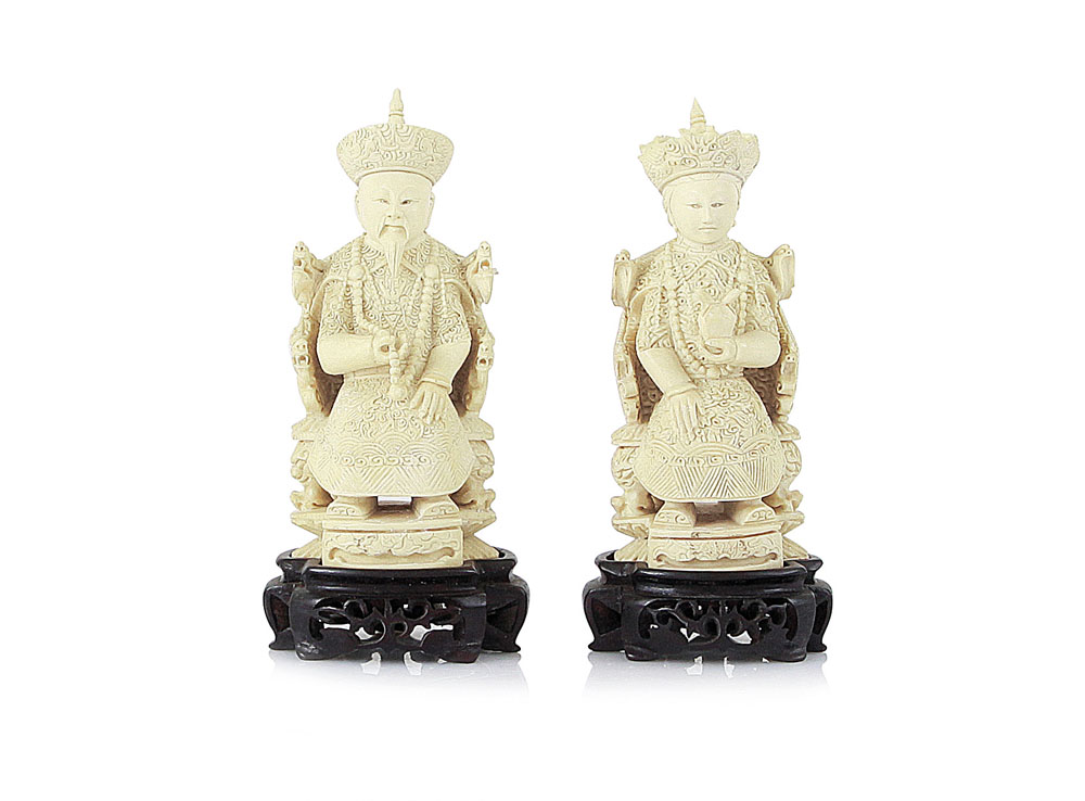 COPPIA DI SCULTURE IN AVORIO, CINA, INIZIO XX SECOLO, raffiguranti imperatori su trono con basi in legno.