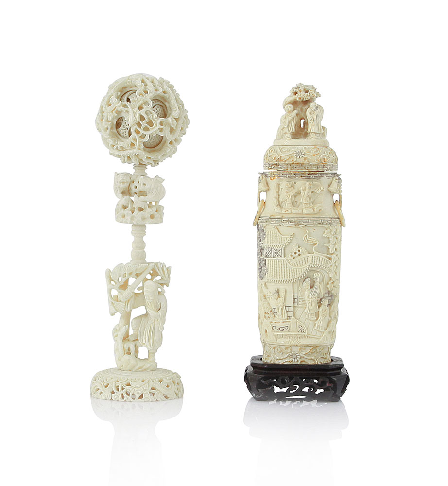 UN VASO CON COPERCHIO E UN OCCHIO DI BUDDHA IN AVORIO, CINA, INIZIO XX SECOLO, vaso biansato ad anelli con figure entro paesaggio a rilievo e occhio di Buddha traforato con figure e animali.