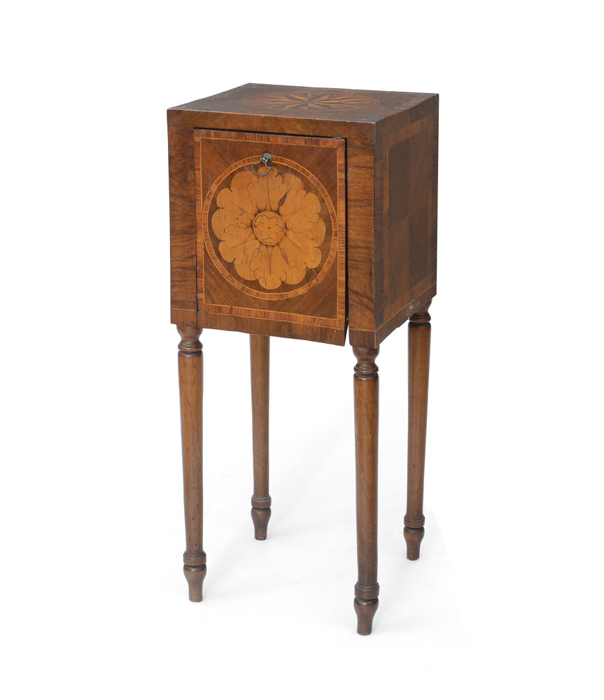 MOBILETTO LUIGI XVI INTARSIATO IN LEGNI VARI, FINE XVIII SECOLO, fronte ad un'anta centrata da rosone, alte gambe rastremate; sbeccature e usure.