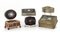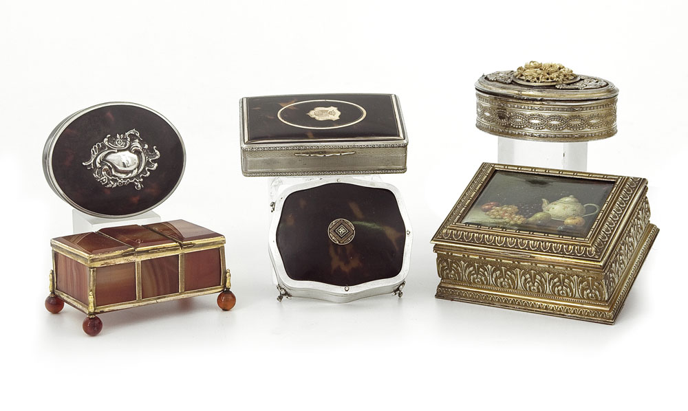 SEI DIVERSI COFANETTI, XIX-XX SECOLO, tre in tartaruga e argento, uno in pietra dura e oro bassa caratura, uno in metallo dorato con applicazione in avorio scolpito e uno in bronzo con miniatura sul coperchio raffigurante "natura morta", firmata.