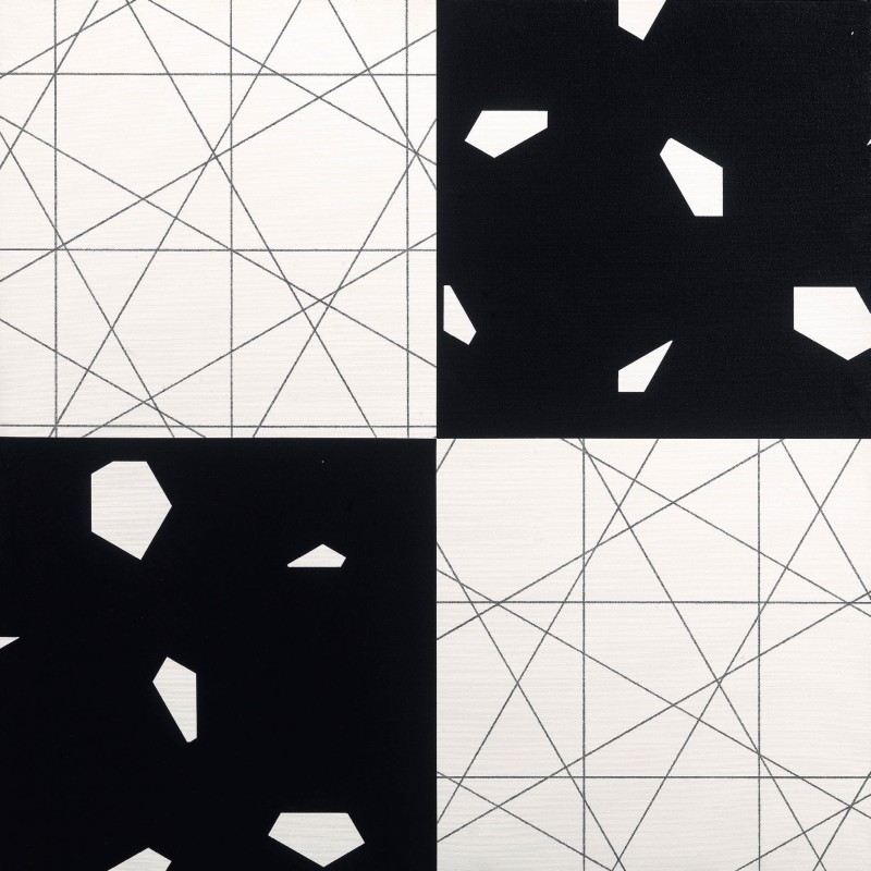 François Morellet Cholet 1926 3 trames strip-teasing (0°-30°-60°) 4 fois noir et blanc, 2008 Acrilico su tela tesa su tavola, cm. 100x100 Al verso titolo, firma e data: N. 08019 "3 trames strip-teasing (0°-30°-60°) 4 fois N. et B." / Morellet / 2008. Esposizioni: François Morellet, Joël Stein, 82x2=2008, Firenze, Santo Ficara Arte Moderna e Contemporanea, settembre 2008, pp. 34, 35, illustrato a colori.