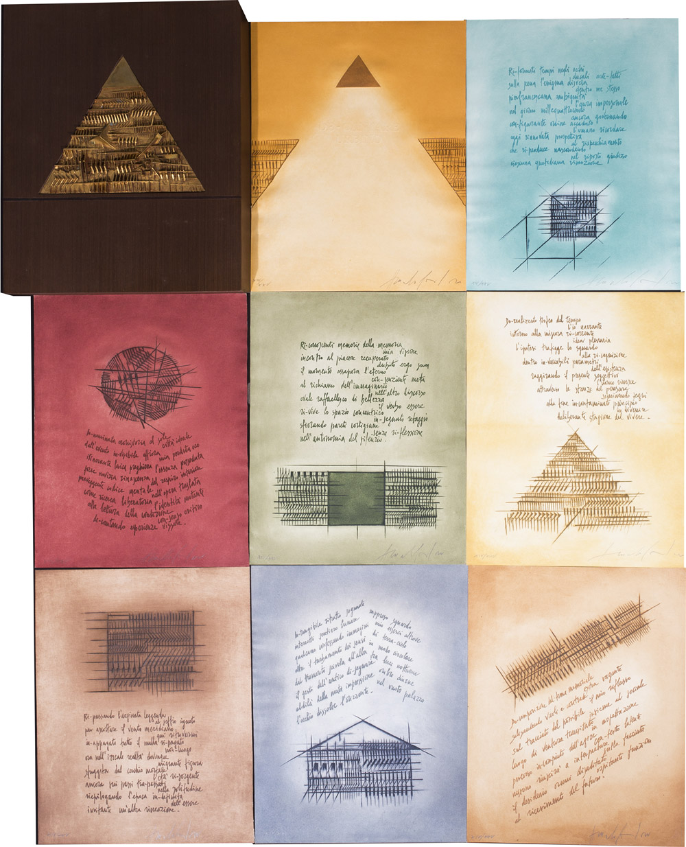 Bassorilievo in bronzo incastonato entro tavola di legno contenente otto incisioni a colori di Arnaldo Pomodoro, un testo poetico di Miklos N. Varga, uno scritto di Paolo Volponi e un Colophon