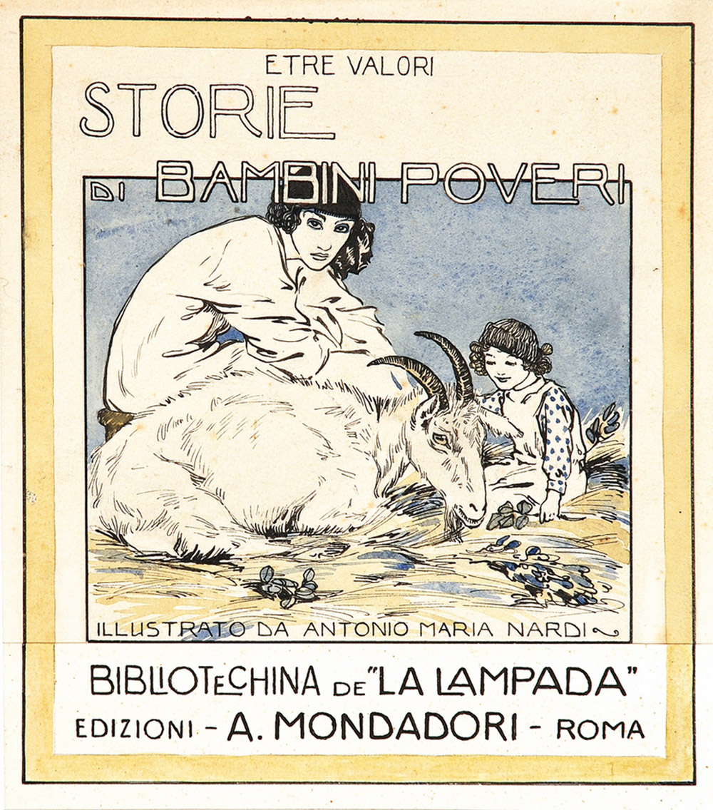 Originale di copertina per l’opera di Etre Valori, pubblicata nella Bibliotechina de “La Lampada”, edita da Mondadori nel 1919. China e acquerello su cartoncino cm 27,5x29 (disegno cm 18x21 circa). In eccellente stato. Attivo dal 1915 nell’illustrazione di libri per ragazzi, dopo la guerra il pittore avvia importanti collaborazioni con diverse case editrici, fra cui Mondadori. Tra il 1920 e il 1930 illustra circa 50 libri, contribuendo nel frattempo a periodici fra cui “Il Corrierino”, il “Corriere dei Piccoli”, “Ragazzi d’Italia” e “Topolino”. Nel 1921 espone alla I Biennale Romana; nel 1924 inizia a lavorare in campo pubblicitario. Dalla metà degli anni ’20 Nardi consacra gran parte dellasua arte al tema religioso; produce, in oltre 40 anni, innumerevoli pale d’altare, dipinti, vetrate. «Le sue illustrazioni […] coniugano languori preraffaelliti e modernità classica, salda esperienza anatomica e grazia japoniste cara alla grafica liberty di autori quali Arthur Rackam, come testimoniano anche le più tarde silhouettes in bianco e nero disegnate per la traduzione italiana del romanzo per ragazzi di Ethel Turner Sette piccoli australiani (Paravia, Torino 1926). F. Franco, Antonio Maria Nardi, Dizionario Biografico degli Italiani, Vol LXXVII, Treccani, Roma, 2012.