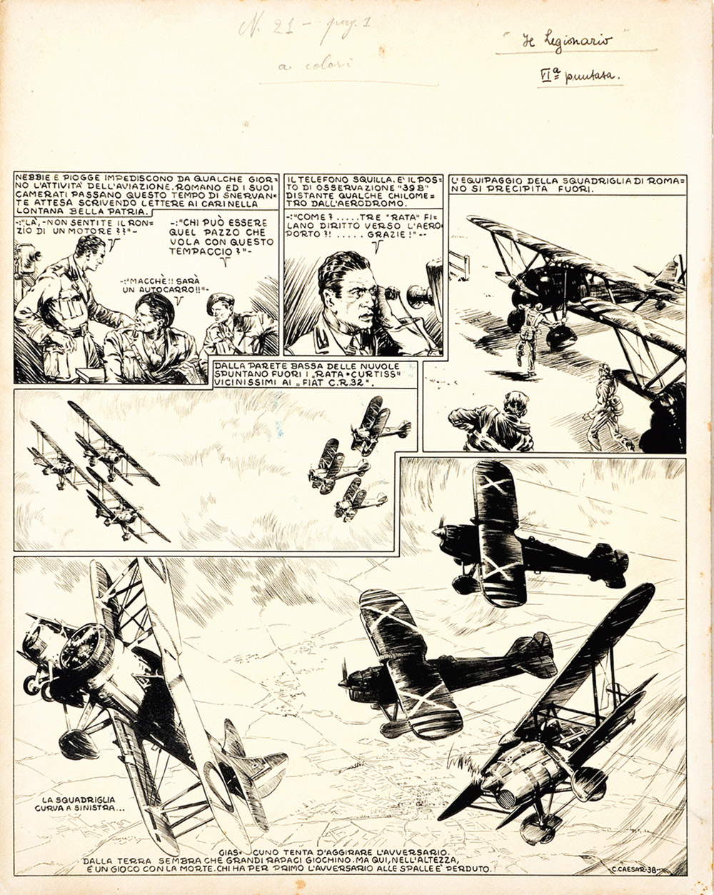 Prima tavola originale della sesta avventura del pilota, pubblicata sul n° 21 de “Il Vittorioso”, 1938. Matita e china su cartone cm 28,5x35,7, firmata e datata in basso a destra. In eccellente stato. Il fumettista ed illustratore di origine tedesca Kurt Kaiser (in arte Caesar) si stabilisce in Italia negli anni ’30. Qui inizia a realizzare storie a fumetti come I due tamburini (1935), Will Sparrow eroe dell’aria (1937) e Il crociato nero (1938). Nel 1938 crea per la Ave il personaggio di Romano il Legionario, inizialmente eroe della guerra civile spagnola dalla parte franchista poi combattente nella Seconda Guerra Mondiale. Per quanto riguarda le anatomie Caesar è sicuramente in debito con Alex Raymond. Dalla sua, la straordinaria capacità di rendere i mezzi bellici, siano essi carri armati, navi o aeroplani, e le scene di battaglia. Nel 1941 partecipa alla Campagna d’Africa, realizzando reportage grafici dal vivo per l’Africa Korp. Nel dopoguerra è uno dei disegnatori “portanti” per le Edizioni Ave. Memorabili le sue tavole tecnico-didattiche per i paginoni de “Il Vittorioso”.