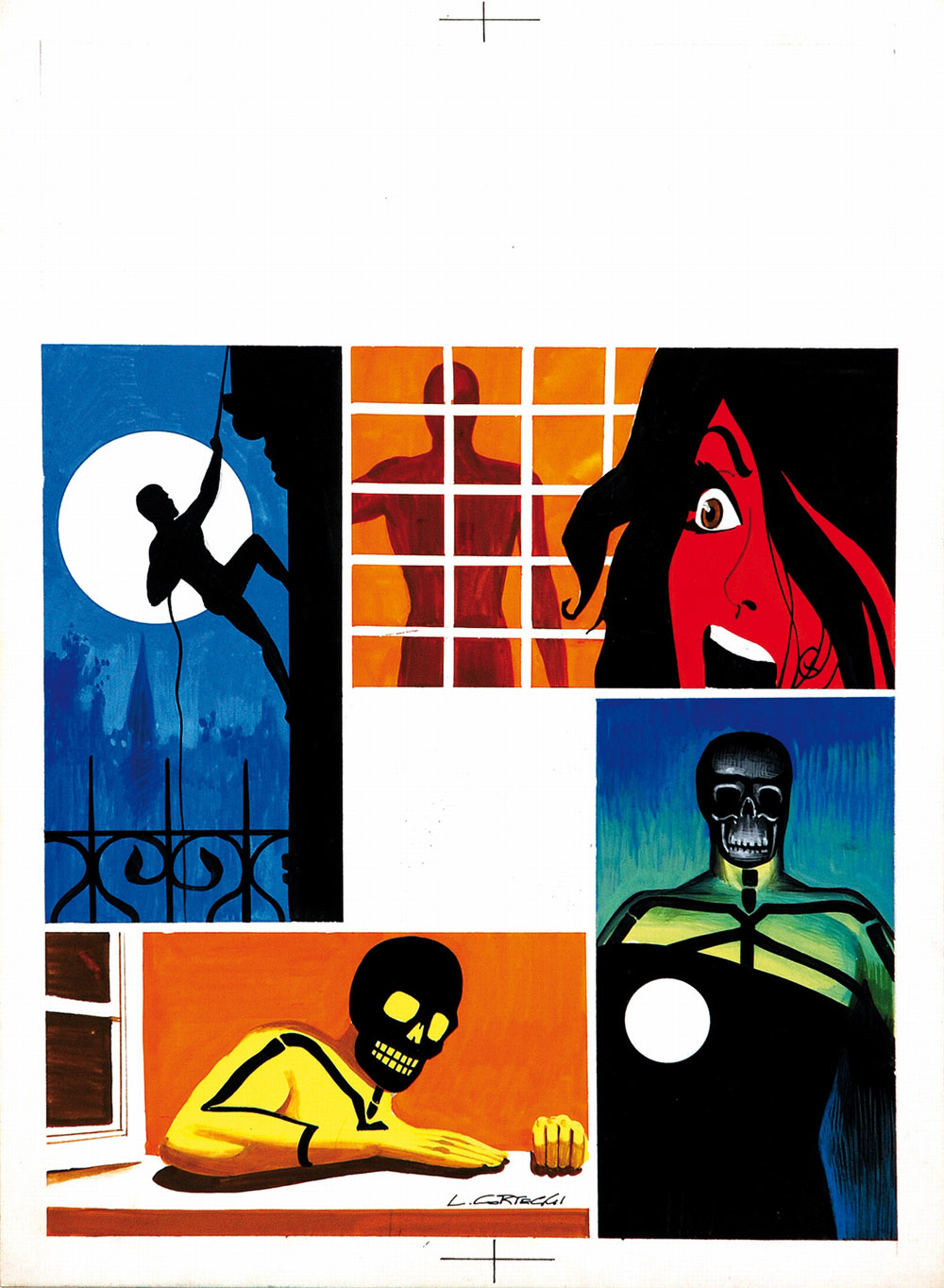 Originale di copertina per il n° 134, pubblicato il 18 gennaio 1968. Tempera su cartone cm 20,2x27,5. Firmata, in eccellente stato. Autentico pittore prestato al fumetto, il flemmatico Corteggi ha realizzato, a partire dai primi anni ’60, moltissime copertine per l’Editore Corno (“Guerra d’Eroi”, “Gesebel”, “Dennis Cobb”, “Kriminal”, “Satanik”, “Alan Ford”…) e quindi per la Sergio Bonelli (“Il Piccolo Ranger”), editore per il quale lavora come art director. Le sue tavole a tempera costituiscono una sorta di pinacoteca di gusto surrealista che non sfigurerebbe in alcun museo di arte contemporanea.