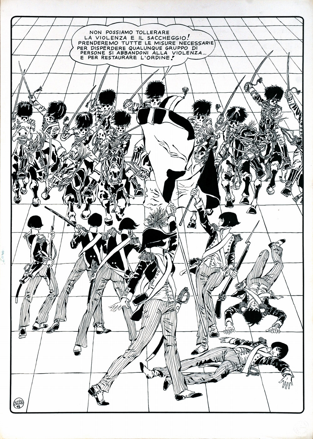 Tavola originale per il racconto introduttivo alla riedizione in volume de I Sotterranei (1968). Matita e china su cartoncino Schoeller cm 36,5x51. Firmata e datata in basso a destra, in eccellente stato. Una delle sensazionali tavole a pannello intero. Per la figura di Valentina con bandiera e fucile Crepax cita il grande pittore romantico Eugène Delacroix e il suo famoso dipinto Le 28 Juillet. La Liberté guidant le peuple, che commemora la Rivoluzione Francese del 28 luglio 1830.