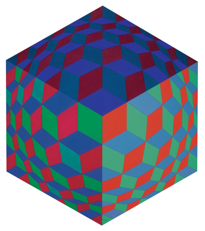 Victor Vasarely Pecs 1908 - Parigi 1997 Hat-VI, 1971 Acrilico su tavola, cm. 93x80 Firma in basso al centro: Vasarely, al verso: 2350 / "Hat-IV" / 1971 - Vasarely: cartiglio Atelier Vasarely: etichetta e timbro Galleria Levi, Milano, con n. 469/8: etichetta e timbro Galleria d'Arte Sianesi, Milano. Foto autenticata dall'artista, Annet-sur-Marne, 27.10.1980, con timbro Galleria d'Arte Il Mappamondo, Milano, con n. 273; certificato su foto di Michelle Vasarely, Parigi, 3 novembre 1992, con n. 310.