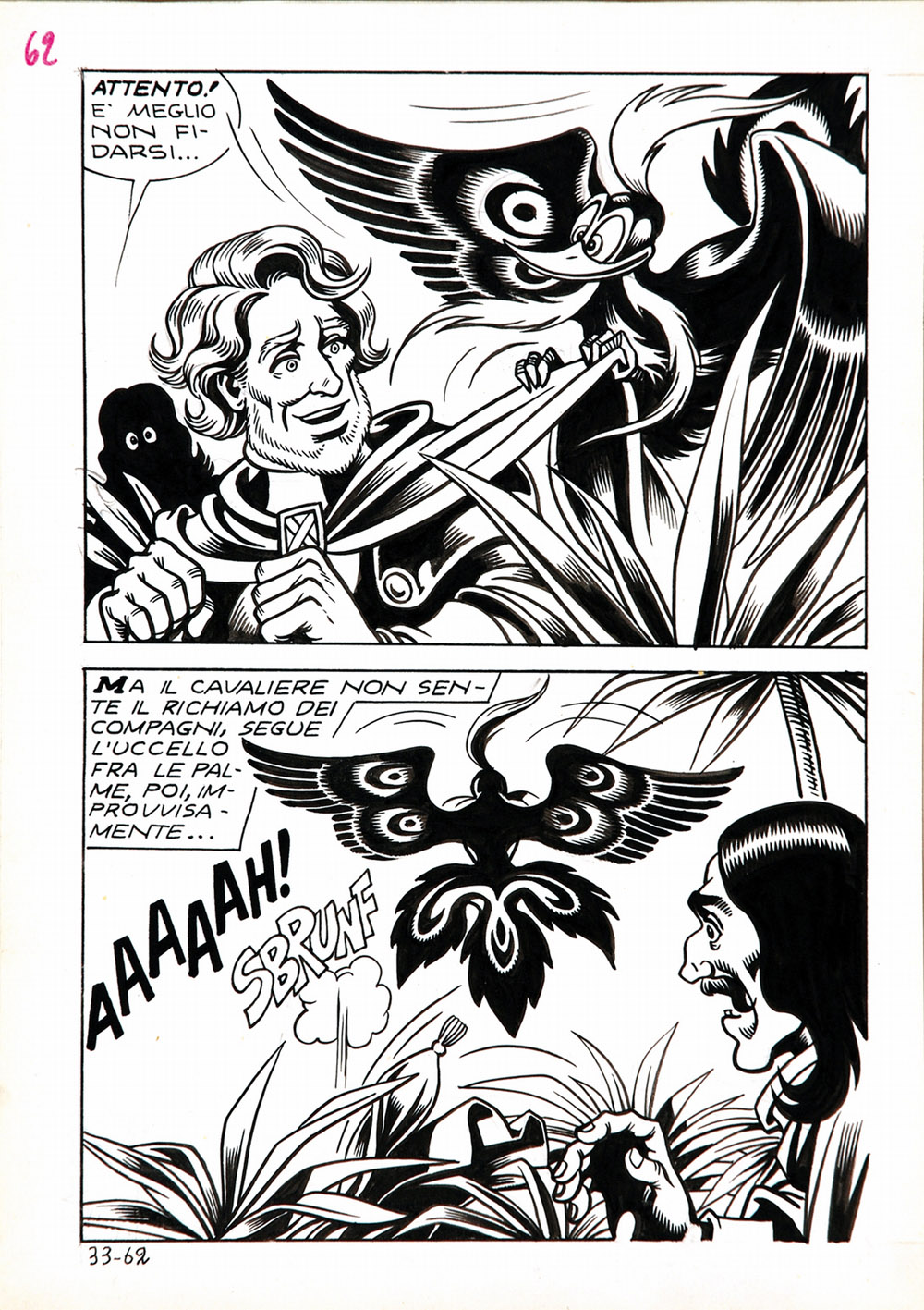 Matita e china su cartoncino cm 17x25. Tavole 61 e 62 realizzate per la storia pubblicata su “Sexy Favole” n° 33 del novembre 1974. In eccellente stato. Roberto Raviola, in arte Magnus, ha esordito giovanissimo come illustratore. Il successo è arrivato sin dagli anni ’60 con i personaggi neri di Kriminal e Satanik, realizzati in tandem con Luciano Secchi. Dopo il successo di Alan Ford l’artista bolognese si è dedicato a progetti più ambiziosi grazie al suo tratto inconfondibile e via via sempre più raffinato, curato in ogni minimo particolare. Inizia a lavorare per la Edifumetto, impiegando questi anni alla ricerca di un nuovo stile, che porterà a una rivoluzione dei fumetti di genere erotico. Negli anni settanta pubblica: “Mezzanotte di morte”, “Quella Sera al Collegio Femminile”, “Il Teschio Vivente” e “Dieci Cavalieri e un Mago”.