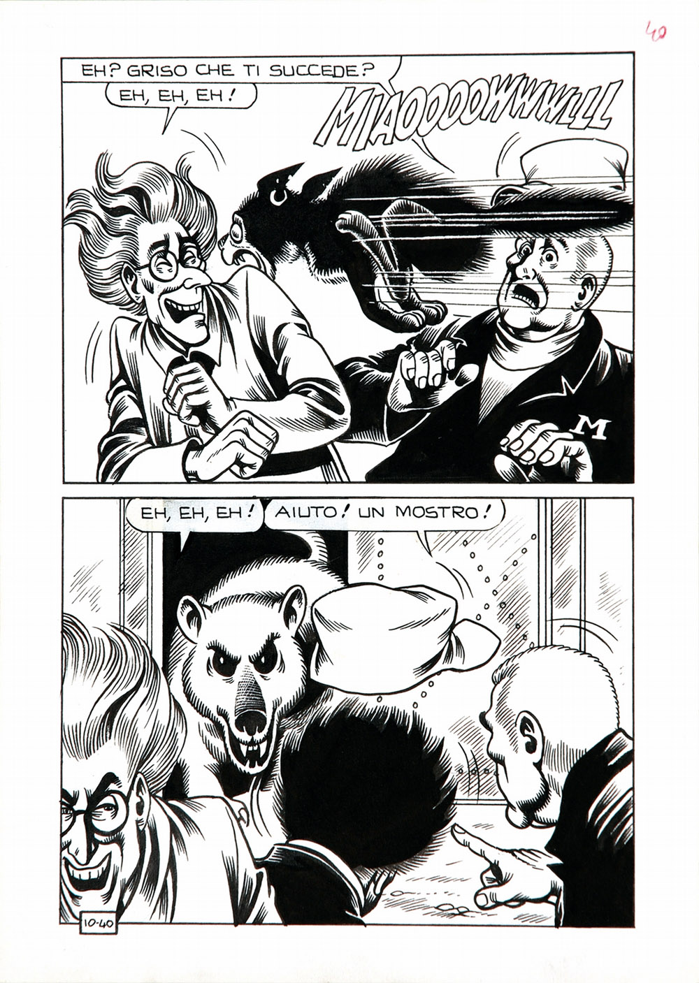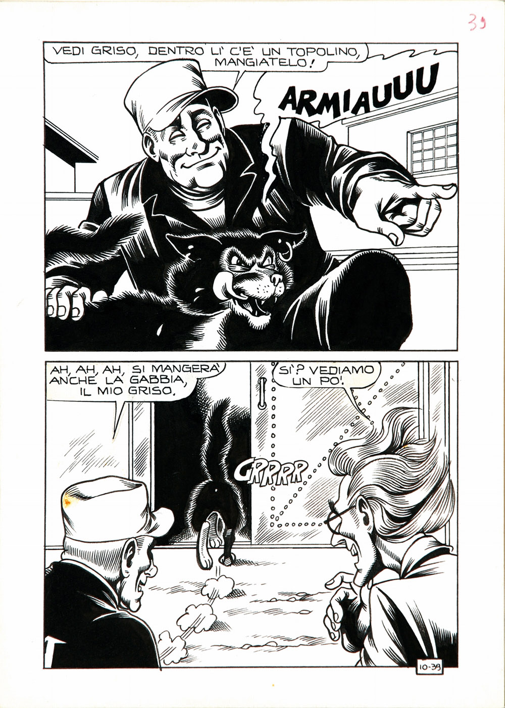 Matita e china su cartoncino cm 18,2x25,5. Tavole 39 e 40 per la storia pubblicata sul n° 10, gennaio 1970. In eccellente stato. Nel 1964 Magnus viene ingaggiato da Luciano Secchi (in arte Max Bunker), uno sceneggiatore in erba che ha deciso di seguire il filone del noir aperto nel 1962 da "Diabolik". Per conto dell'Editoriale Corno la coppia Magnus e Bunker partorisce Kriminal e Satanik, a cui faranno seguito altri fortunati personaggi. Nel 1967, Magnus e Bunker creano un nuovo personaggio: Alan Ford, che vedrà la stampa nel maggio del 1969. Le tecniche di disegno di Magnus e l'uso del bianco e nero gettano le basi per un nuovo genere di fumetti che mescola il nero al grottesco. Magnus disegnerà ininterrottamente la saga di Alan Ford fino al n° 75 (settembre 1975), che segna il suo abbandono dell'Editoriale Corno e la rottura del sodalizio con Max Bunker. Tornerà eccezionalmente a disegnare un numero di Alan Ford in occasione della pubblicazione del n° 200 della serie, nel 1986.