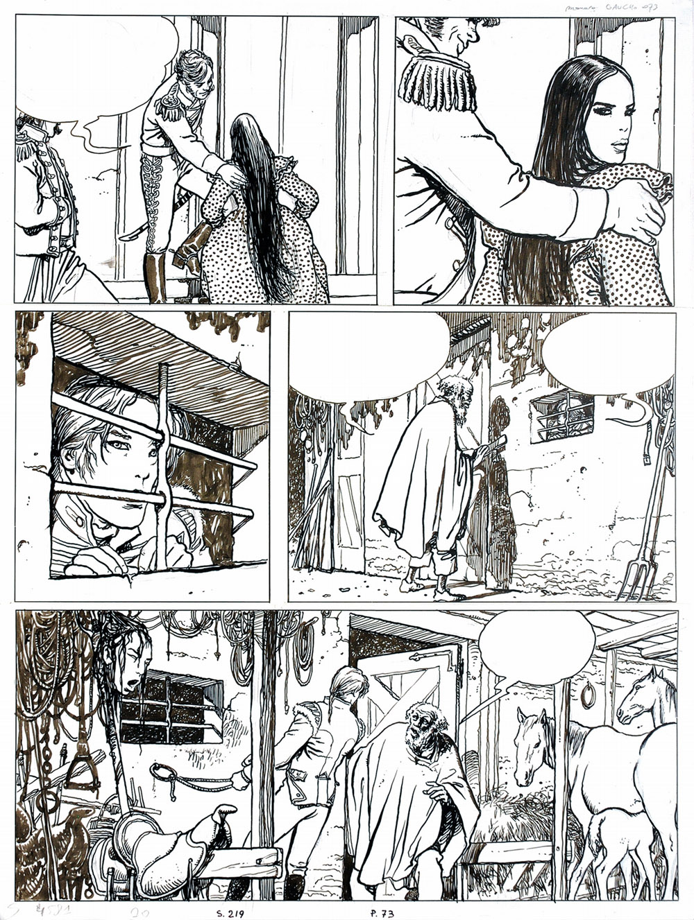 Tavola composta da tre strisce raccordate al retro. Matita e china su cartoncino, ciascuna striscia cm 48x21,5. Non datata ma 1990 circa. Originale per la storia pubblicata su “Il Grifo” dal 1991 al 1994. In eccellente stato. Dopo Tutto ricominciò con un’Estate Indiana Hugo Pratt e Milo Manara tornano a collaborare per la seconda volta nei primi anni ’90. La sceneggiatura di Pratt e le matite di Manara partono dalla conquista dell’Argentina da parte della potenza militare inglese nel giugno del 1806 per narrare le vicende di poveri, prostitute, storpi e schiavi, tutti in cerca di una propria impossibile libertà, spesso destinati a una tristissima fine. Le loro storie si mescolano con le vite dei potenti e con la storia con la S maiuscola, dando vita a un quadro tragico, fatto di intrecci politici e di lotte fra poveri.