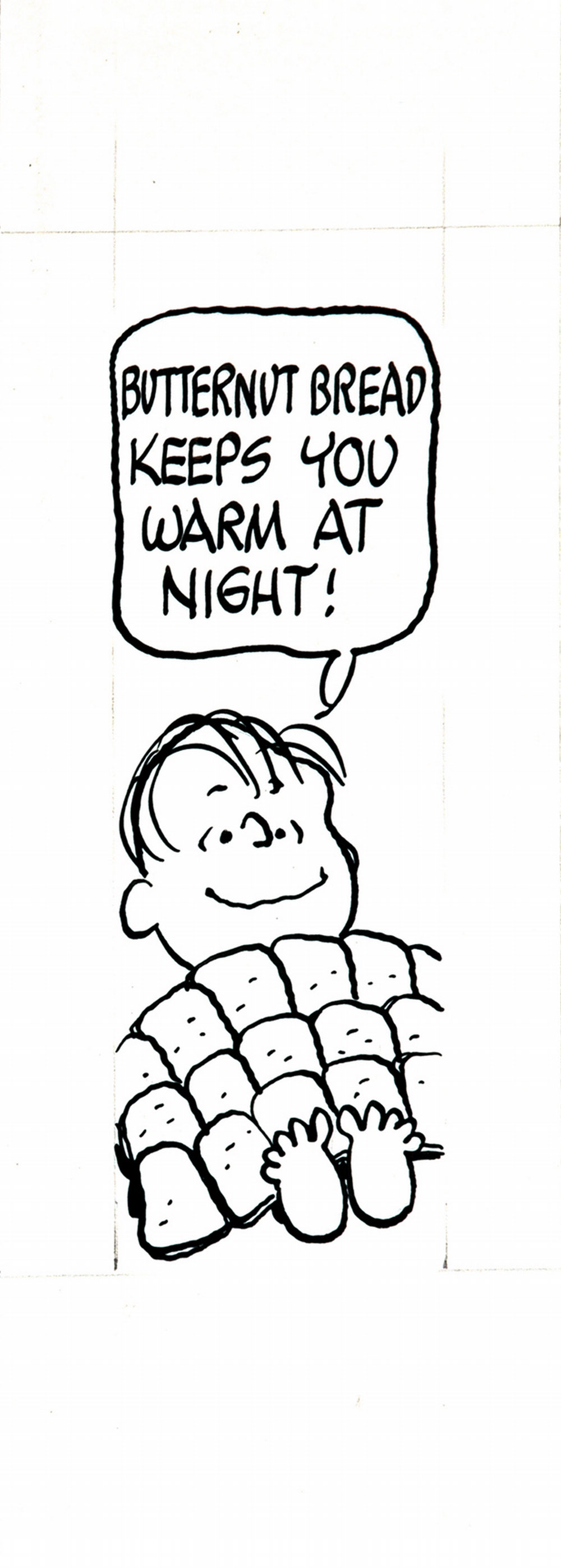 Matita e china su cartoncino cm 7,5x22 (opera cm 4,5x14 circa). In eccellente stato. Illustrazione per la campagna pubblicitaria dedicata al marchio Butternut Bread - che produceva un particolare tipo di pane bianco arricchito - realizzata tra il 1967 e il 1969.