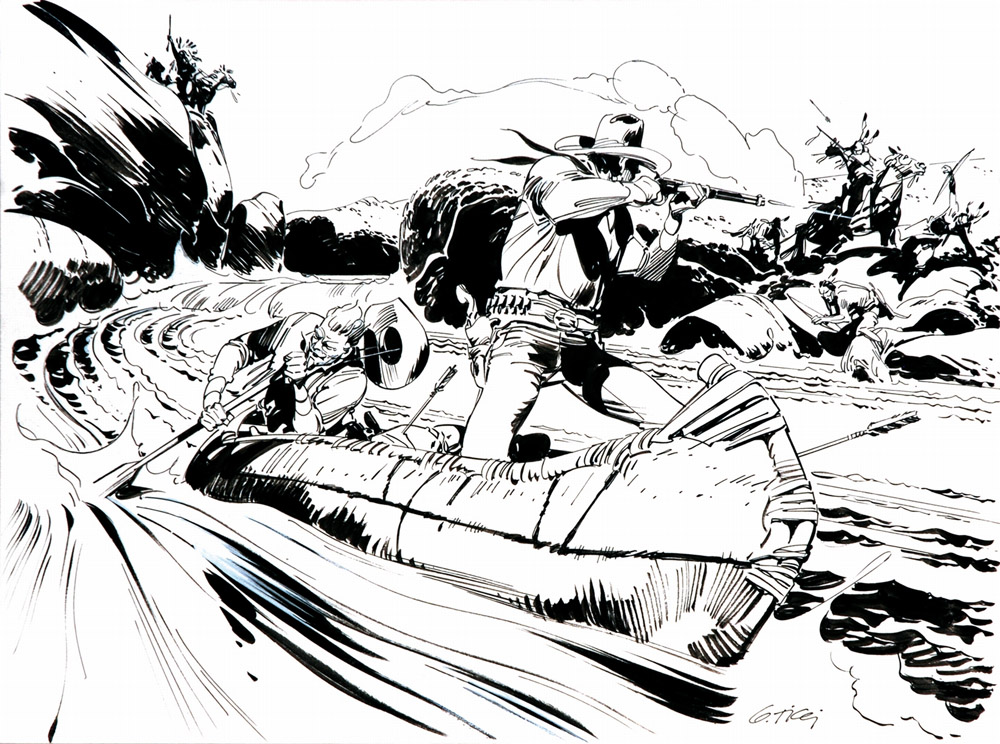 Matita e china su cartoncino cm 34x25. Illustrazione originale pubblicata a pag. 143 di Tex - L’Avventura e i Ricordi di Ticci e Verger, Little Nemo 2013. In eccellente stato, firmata in basso a destra. Il fiume scorre impetuoso nel suo letto di pietra scavato in un territorio aspro e selvaggio. Una canoa solca la corrente, balzando con lei di rapida in rapida. Lungo entrambe le rive, indiani inferociti intendono fermarla, uccidendone gli occupanti. Per chiunque, non ci sarebbe scampo… Ma sulla canoa ci sono Tex Willer e Kit Carson. Ed è il sangue dei nemici ad arrossare le rive, ogni volta che Aquila della Notte fa fuoco, mentre Capelli d’Argento pagaia per allontanarsi (cfr. Moreno Burattini, Sangue sulle Rive, testo che accompagna l’iilustrazione). Solo un artista come Ticci poteva raccontarci tutto questo in una sola immagine.