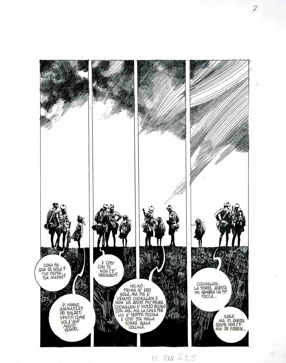 Settima tavola per una storia ambientata durante la Rivoluzione Irlandese del 1916 pubblicata su “Alter Linus”. Matita e china su cartoncino da disegno cm 36,5x51 (illustrazione cm 25,5x35). In eccellente stato Sergio Toppi esordisce negli anni ’50. Dopo una collaborazione con gli studi Pagot, approda al fumetto nel 1966, sulle pagine del “Corriere dei Piccoli”. In seguito collabora con le più importanti testate del settore: “Sgt. Kirk”, “Linus”, “Alter Alter”, “Il Giornalino”, “Corto Maltese” “L’Eternauta”, “Comic Art” e “Nick Raider”. Le sue illustrazioni appaiono su “Famiglia Cristiana” il “Corriere della Sera”. Dopo aver realizzato 3 volumi per “Un uomo un’avventura”, nel 1984 Toppi crea Il Collezionista, unico personaggio “fisso” della sua carriera. Dalla seconda metà degli anni ’80 si dedica all’illustrazione. È il più segnico degli autori del fumetto: la sua maniera di intersecare i tratti, lo rende immediatamente riconoscibile. Unico anche il suo utilizzo del linguaggio del fumetto: in quest’opera il taglio profondo verticale mette in contrapposizione la piccolezza umana alla solidità della terra irlandese, mentre le nubi appaiono divenire sempre più incombenti, come a presagire la minaccia che attende i due sprovveduti soldati.