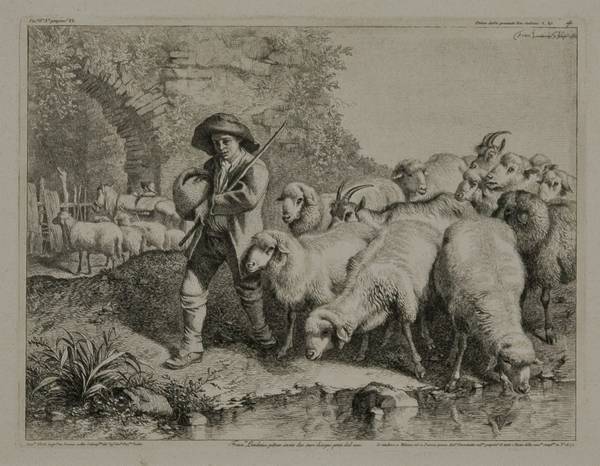 Francesco Londonio Pastore con un sacco che conduce un gregge - 1763 acquaforte, III stato cm. 20x28 Certificato di autenticità a cura di Telemarket, Roncadelle Opera pubb. nel Catalogo Ragionato delle Incisioni di Francesco Londonio, pag. 68, n. 56, Ed. Artes Milano; opera stampata da Antonio Franchetti nel 1837 Firma in alto a dx