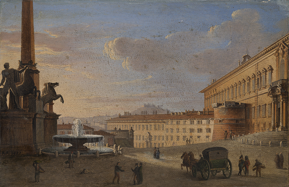 Roberto Roberti (Bassano 1786 - Roma 1817) - (Attribuito) "Piazza del Quirinale" 1820 olio su tela (cm 16x24) Siglato e datato in basso a sinistra Al retro: tracce di iscrizione; cartiglio In cornice