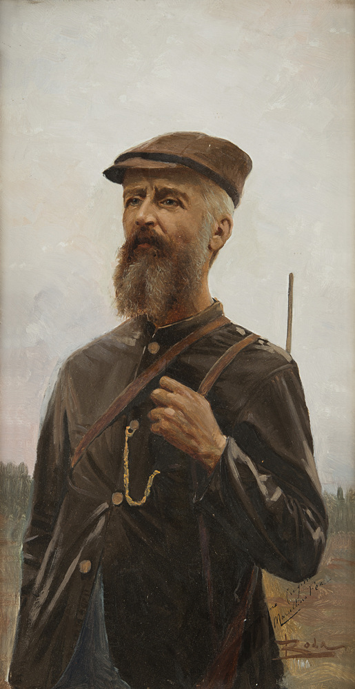 Leonardo Roda (Racconigi 1868 - Torino 1933) - "Cacciatore" olio su cartone pressato (cm 46x24) Firmato e dedicato "Al carissimo cugino Marcellino Fea" in basso a destra In cornice