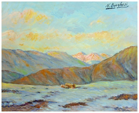 NINO BORGHESI Roma 1892 – Pescia 1982 Neve sul Cimone Olio su tela 40 x 50. Firma in a. a d.; sul verso titolo e misure.