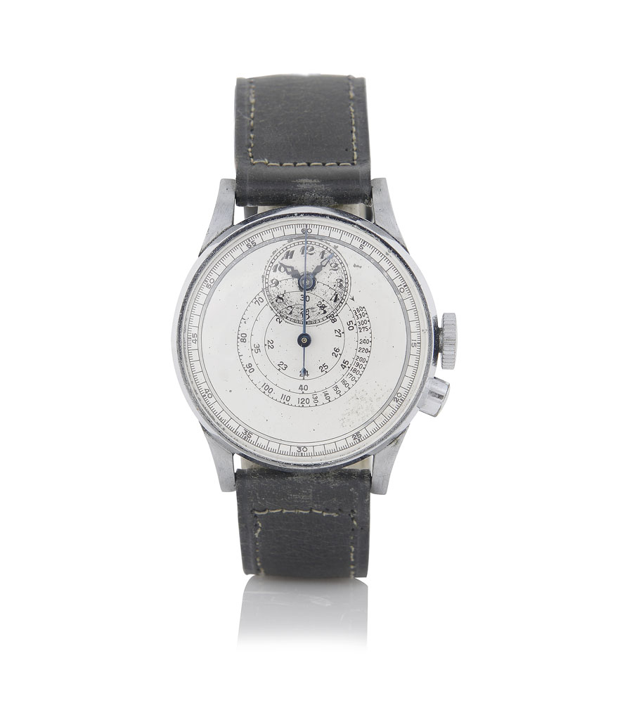 C. in metallo con pulsante ad oliva al 4. Q. argentato con quadrantino decentrato al 12 per le ore, scala tachimetrica a chiocciola. M. Venus cal. 140 a carica manuale.