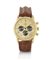 C. n. 06-0191 in oro giallo 18 kt con pulsanti tondi. Q. bicolore champagne e nero con numeri romani applicati, contatore a 30 minuti e 12 ore, data tra il 4/5 e scala tachimetrica periferica. M. a carica automatica. Quadrante, cassa e movimento firmati. Completo di cinturino e fibbia originali.