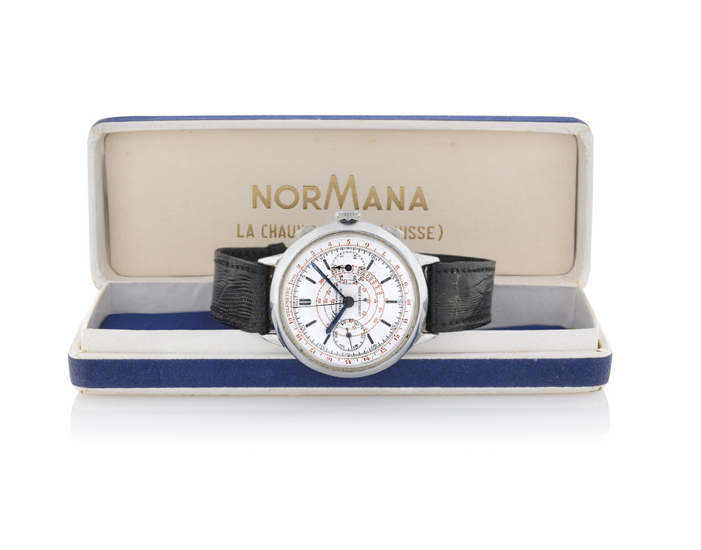 C. in metallo cromato con pulsanti ad oliva ed anse fisse. Q. in smalto con indici smaltati, contatore a 30 minuti, scala telemetrica periferica e tachimetrica a chiocciola. M. Valjoux cal. 22 a carica manuale. Quadrante e movimento firmati, cassa numerata. Completo di astuccio originale.