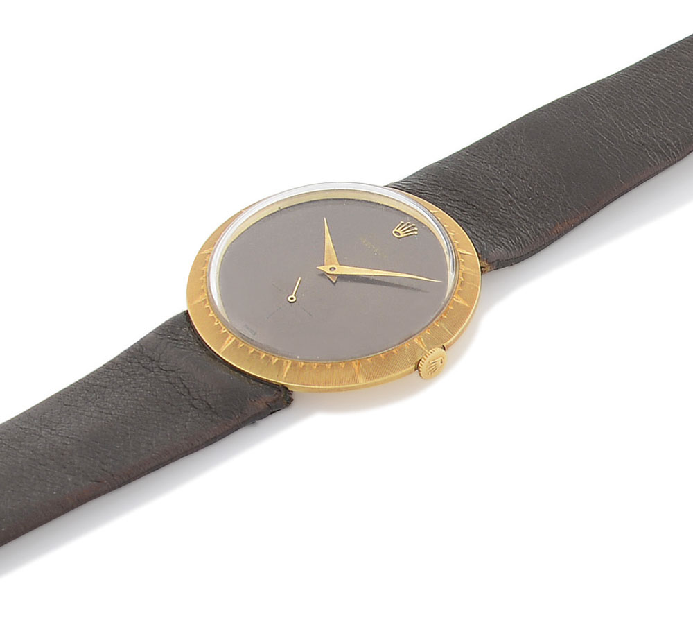 C. n. 687852 in oro giallo 18 kt con anse nascoste e lunetta graduata. Q. color bronzo con secondi al 6. M. n. 651867 a carica manuale. Quadrante, cassa e movimento firmati. Completo di fibbia originale.