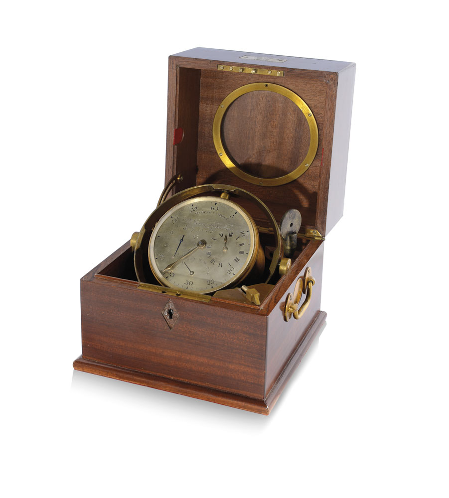 C. circolare in ottone dorato, basculante entro cassa in legno, placca frontale in avorio con inscritto A.te Louis Berhoud n. 12 Paris. Q. argentato con divisione a 60 minuti, ore a numeri romani decentrati al 3, minuti al centro e secondi al 9, riserva di carica (49 ore) al 6. M. con scappamento Detent. Quadrante, cassa e movimenti firmati e numerati.