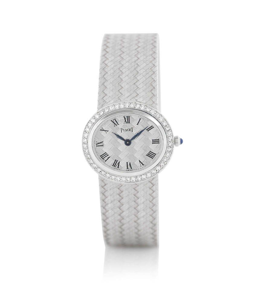 C. n. 140905 ovale in oro bianco 18 kt con fondello chiuso da viti, lunetta in brillanti e vetro zaffiro. Q. in oro bianco con numeri romani smaltati. M. a carica manuale. Bracciale a tessuto in oro bianco 18 kt. Quadrante, cassa, movimento e bracciale firmati.