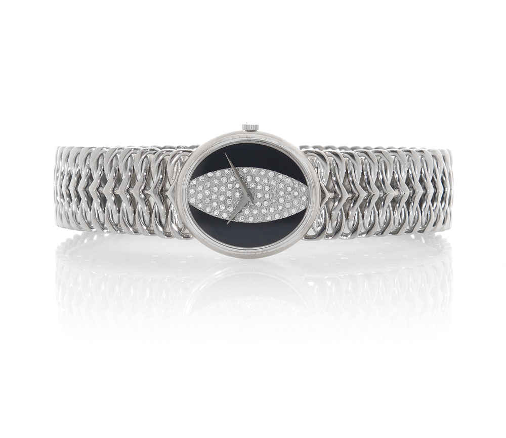 C. n. 287224 ovale in oro bianco 18 kt con fondello chiuso da viti. Q. in onice con pavè di brillanti al centro. M. a carica manuale. Bracciale integrato in oro bianco 18 kt. Quadrante, cassa, movimento e bracciale firmati.