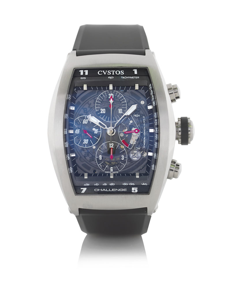 C. tonneau massiccia in acciaio con corona a vite, pulsanti tondi, oblò sul fondello chiuso da viti e vetri zaffiro. Q. scheletrato con indici applicati e lancette luminescenti, contatore a 30 minuti e 12 ore, riserva di carica, 2 giorni, al 3, data tra il 4/5, lunetta periferica con numeri arabi smaltati e scala tachimetrica. M. a carica automatica. Completo di cinturino in caucciù, fibbia double deployante in acciaio, astuccio e certificato originali.